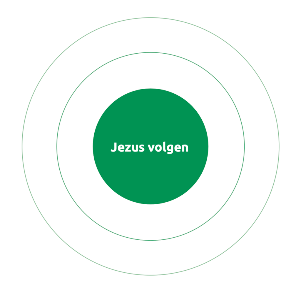 - Welke activiteiten vinden op jullie pioniersplek plaats? Waar zouden jullie deze activiteiten plaatsen in onderstaande cirkel ten opzichte van de kern ‘Jezus volgen’?
